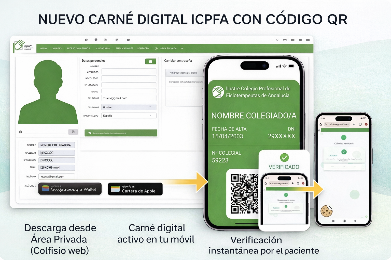 En su proceso de adaptación a las nuevas tecnologías y mejora de los servicios al colegiado, el Colegio ha puesto en marcha un nuevo sistema de carné digital destinado a los profesionales colegiados en el ICPFA. Este nuevo formato permite disponer del documento identificativo directamente en el dispositivo móvil, de forma cómoda y accesible en cualquier momento.